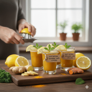 - Shots matinais: Gengibre com limão, água e cúrcuma para quem busca mais energia e metabolismo acelerado.